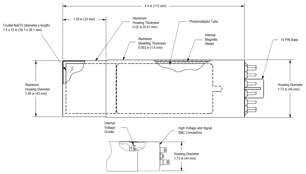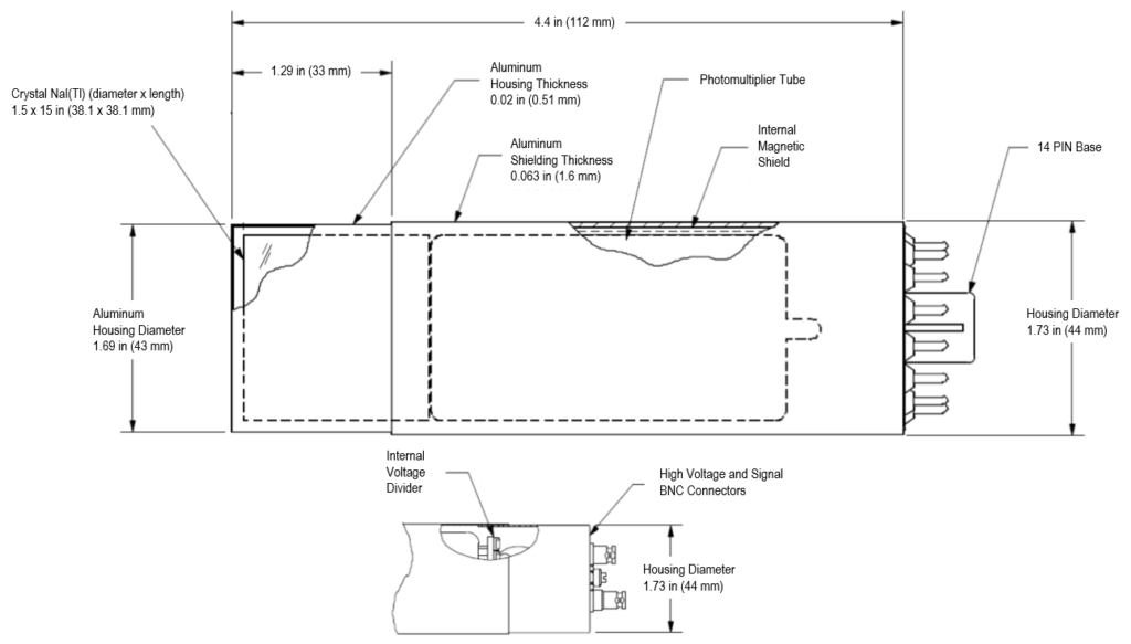 Le détecteur à scintillation à l’iodure de sodium SDA38 est doté d’un cristal NaI(Tl) de 1,5 x 1,5 pouces dans un boîtier en aluminium, comprenant un tube photomultiplicateur, un blindage magnétique interne et des connecteurs BNC de signal et haute tension.