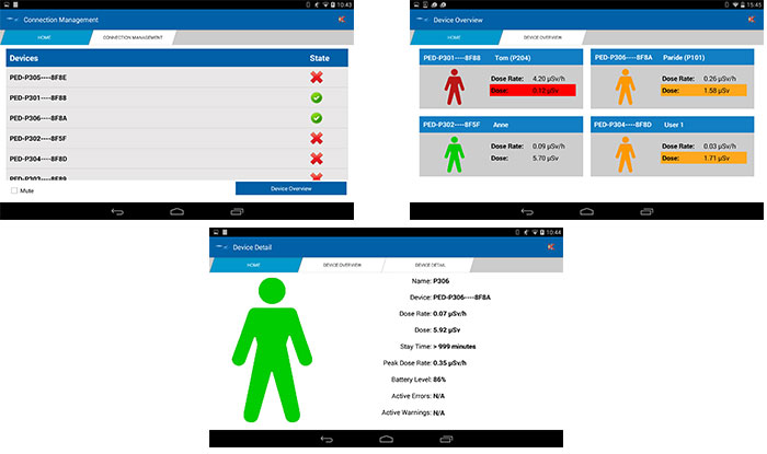 DoseVision™ Live is een nieuwe Android app voor de PED+ waarmee de beheerder real-time meetwaarden tot 7 PED+ dosimeters op zijn Android device ziet.