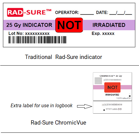 Rad-Sure ChromicVue is a smaller version of the Rad-Sure indicator for gamma and X-ray irradiation. This indicator is ideal for syringe irradiation and aliquot bags for pediatric and neonatal blood irradiation, but is also usable as a substitute for the traditional Rad-Sure.