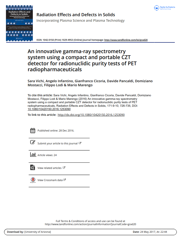 Vichi, S., Infantino, A., Cicoria, G., Pancaldi, D, Mostacci, D., Lodi, F., & Marengo, M. (2016). An innovative gamma-ray spectrometry system using a compact and portable CZT detector for radionuclidic purity tests of PET radiopharmaceuticals. Radiation Effects and Defects 171, 9-10, pages 726-735. doi: 10.1080/10420150.2016.1253090