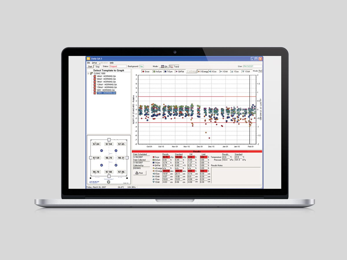 Daily QAâ„¢ 3 sets the standard for efficient and powerful routine QA. A single beam measurement results in five beam quality checks. Accepted data is automatically written to a SQL database in real time, where it is available for trending, review and analysis