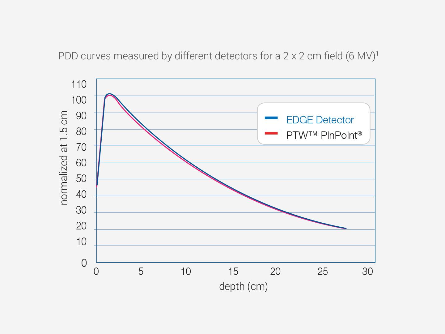 EDGE Detector is comprised of a SunPoint® Diode Detector that is 842 times smaller, and has 100 times more signal, than micro ionization chambers. Its small size makes it ideal for accurate penumbra characterization and steep gradients for fields ≤10 cm.