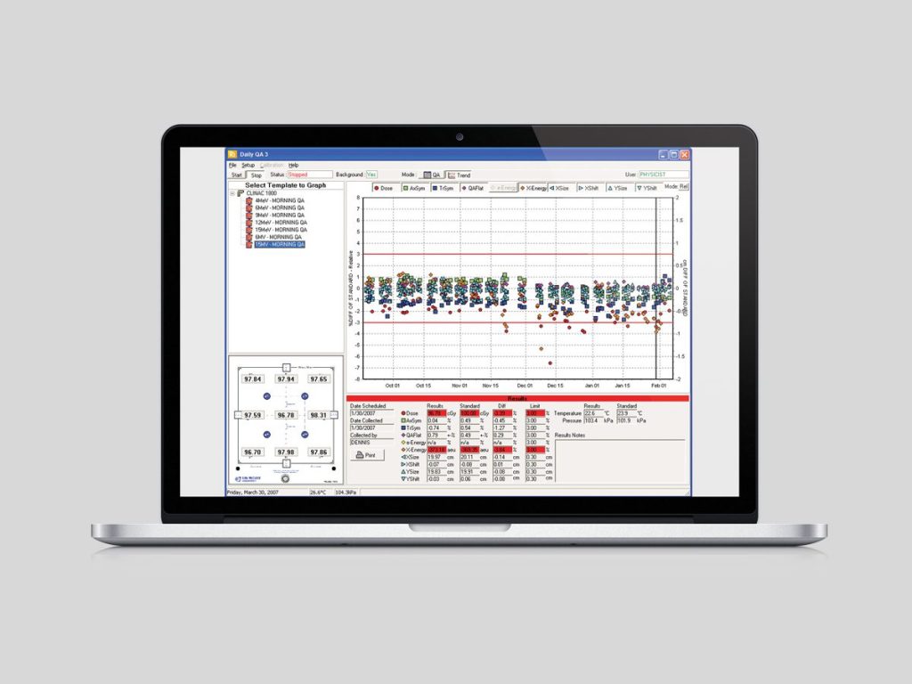 Daily QA™ 3 sets the standard for efficient and powerful routine QA. A single beam measurement results in five beam quality checks. Accepted data is automatically written to a SQL database in real time, where it is available for trending, review and analysis