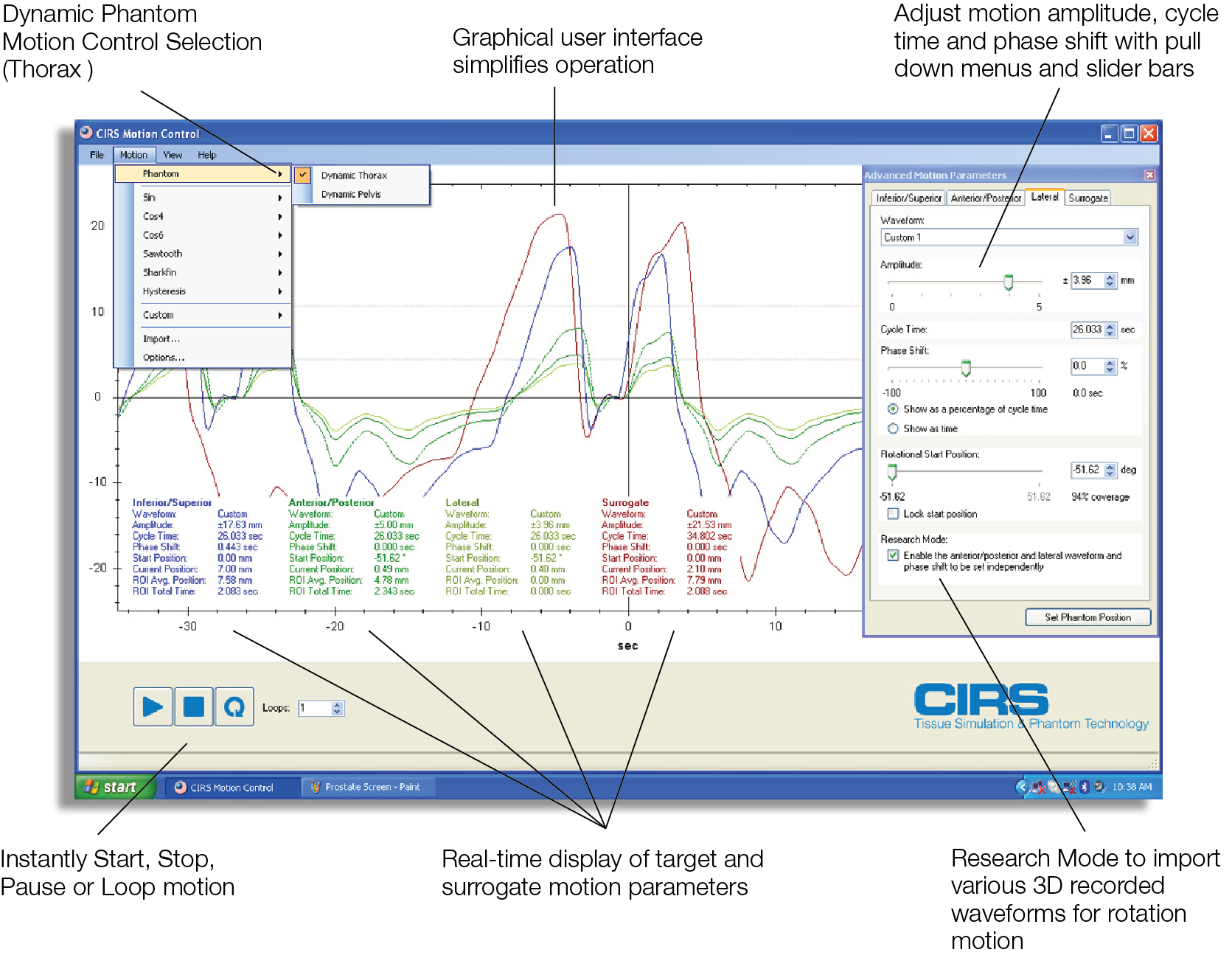 You can control the target and surrogate motion independently with the CIRS Motion Control Software. The graphical user interface provides an unlimited variety of motions while simplifying the operation of the phantom.